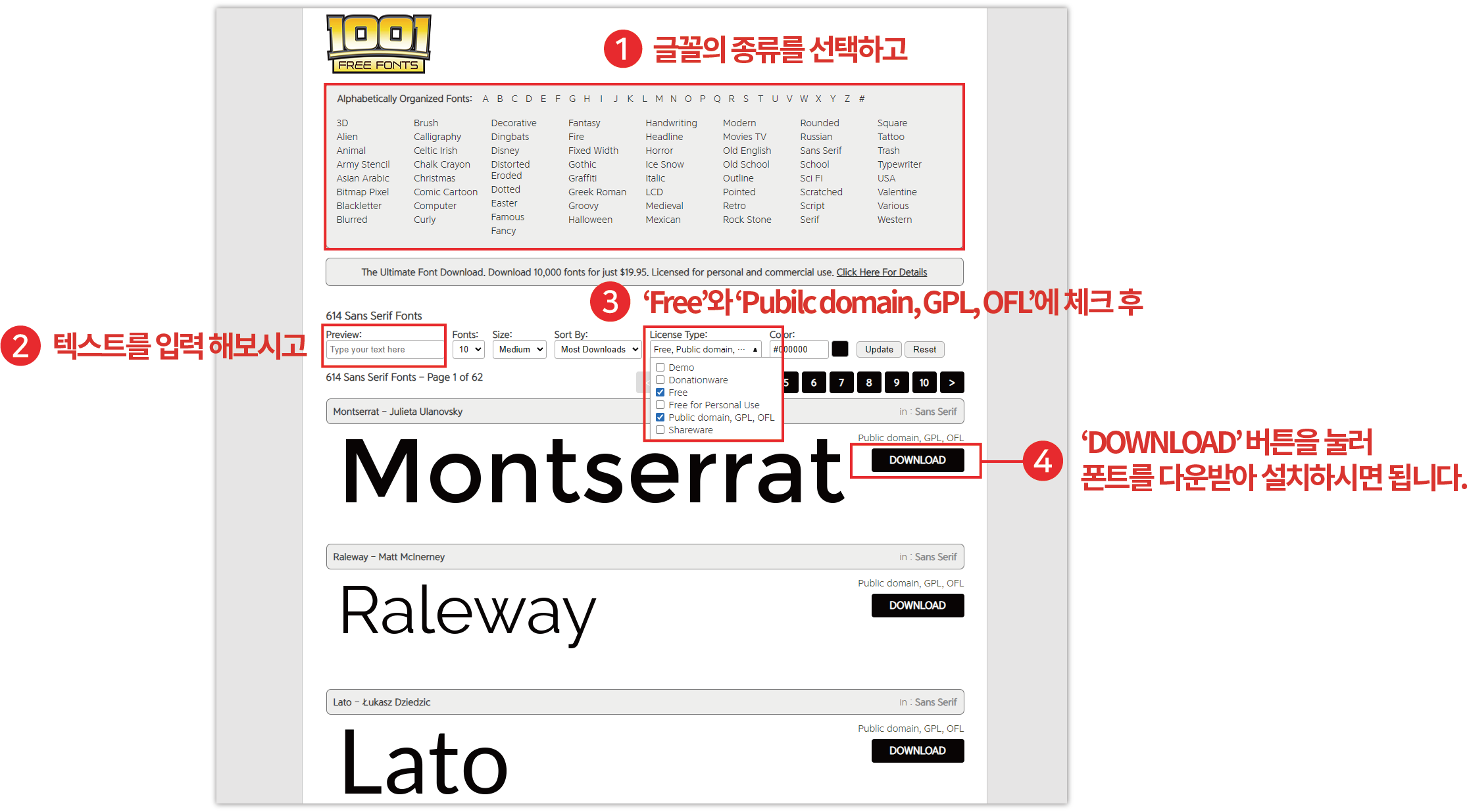 ▼ 1001 Freefonts 사이트 간단 이용 방법입니다.