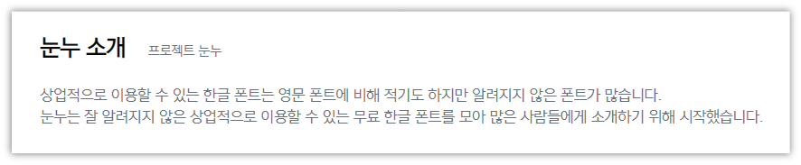 눈누는 상당히 많이 알려져 있는 상업적 무료 폰트 모음 사이트입니다. 한글 폰트가 주를 이루며, 굉장히 다양하고 퀄리티 있는 무료 한글 폰트들을 모아 놓은 사이트입니다.