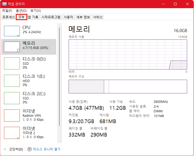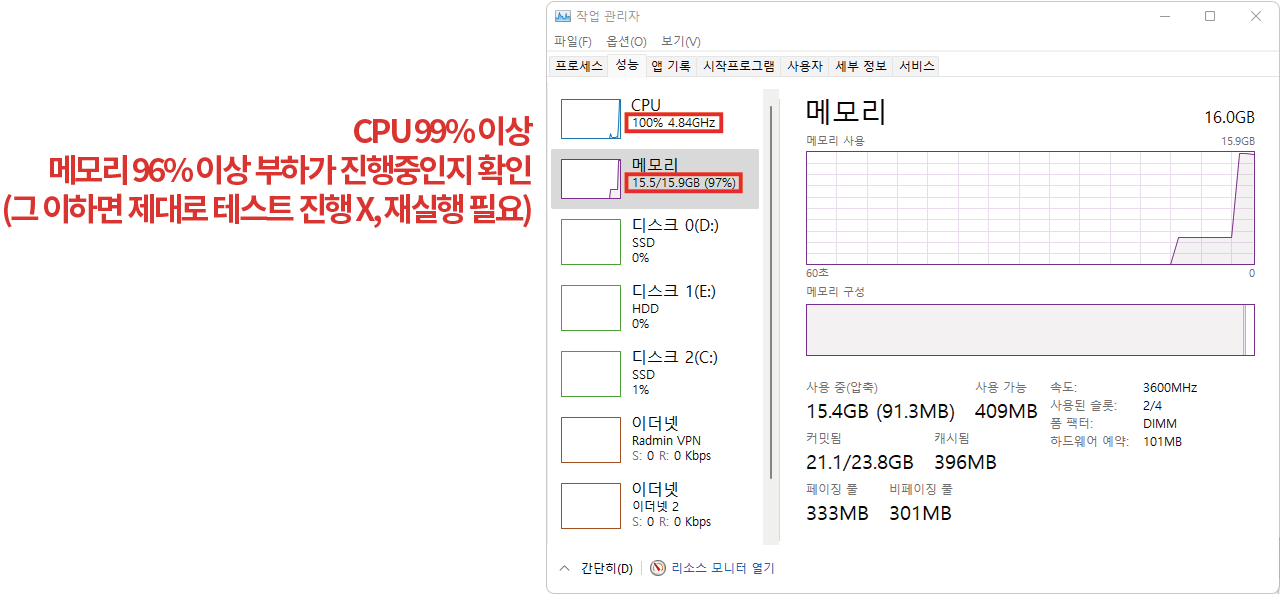 ▼ TestMem5 테스트 시작에 앞서 테스트 시 CPU와 메모리 점유율을 체크하기 위해 작업 관리자 - 성능 탭을 띄워주셔야 제대로 테스트가 진행되고 있는지 확인 할 수 있습니다.