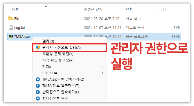 ▼ 다운로드 하신 파일의 압축을 풀고 TM5A.exe를 우클릭하여 관리자 권한으로 실행시키면 바로 테스트가 시작됩니다. (테스트 전 모든 응용프로그램을 종료 해 주세요.)