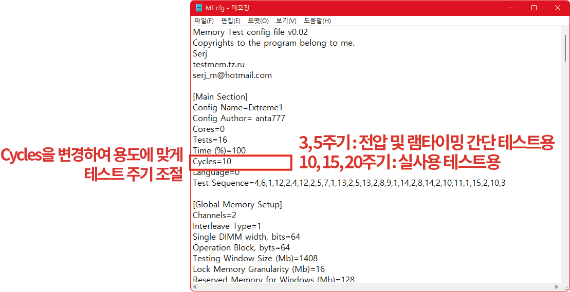 ▼ 용도에 맞게 테스트를 위해 TestMem5 v0.12 Advanced 5 폴더 - Bin - MT.cfg을 메모장으로 실행하여 Cycles 부분을 수정하여 원하시는 테스트 주기를 입력합니다. 이 단계는 건너 뛰어도 괜찮습니다. (따로 건드리지 않으면 기본값은 10주기로 진행됩니다.)