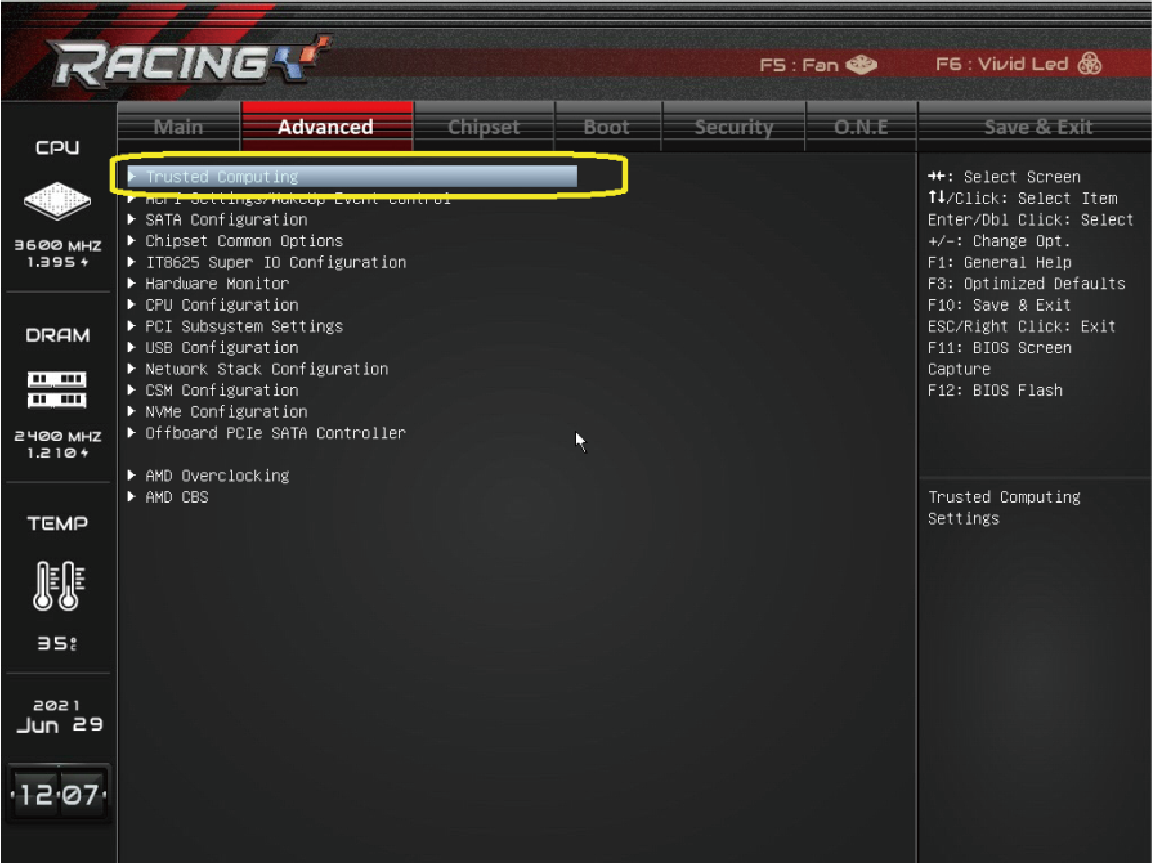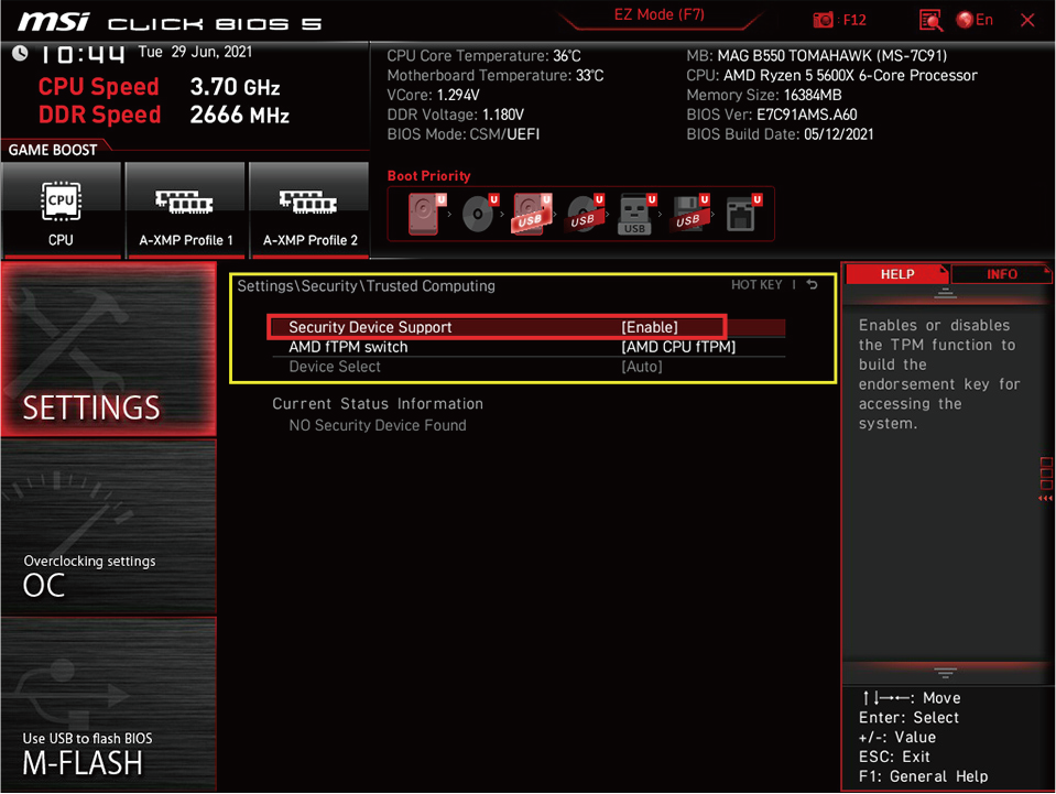 ˙AMD 메인보드 : 'Advanced' 항목으로 이동 후 'Trusted Computing' - Security Device Support' - 'Enable'로 전환