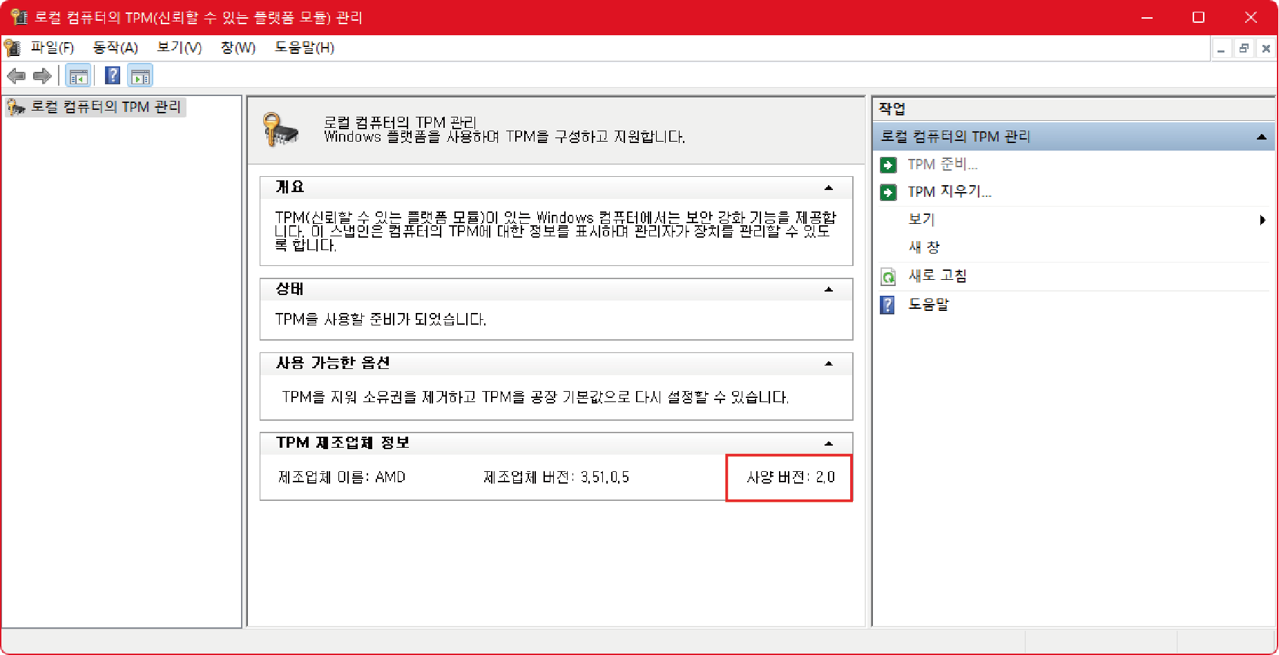 사양 버전이 2.0으로 잘 표시되어 있다면 TPM 2.0이 활성화가 된 것입니다.
