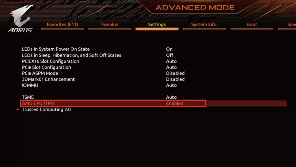 ˙AMD 메인보드 : 'Setting' 항목으로 이동 후 - 'AMD CPU fTPM' - 'Enabled' 로 전환