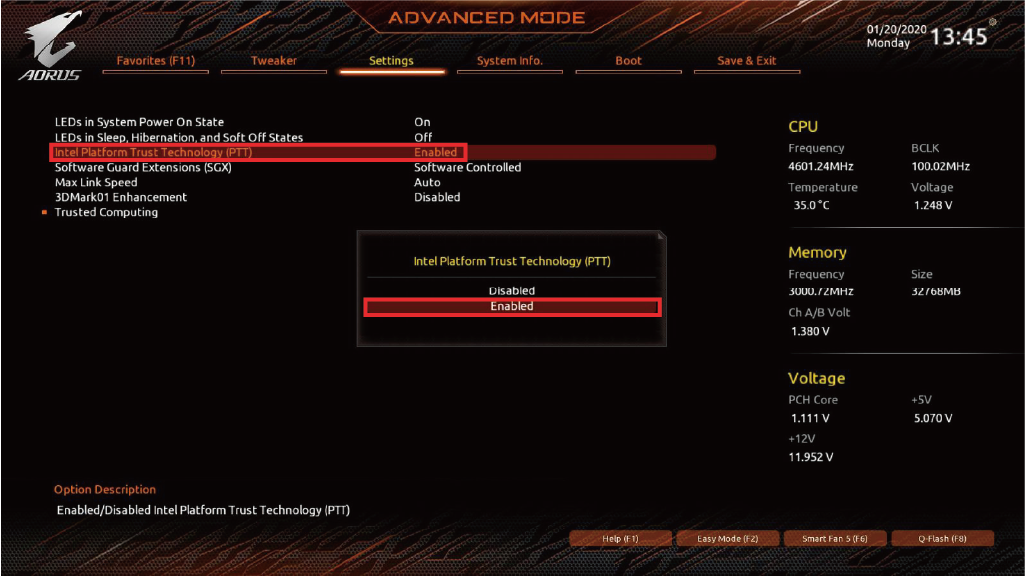 ˙Intel 메인보드 : 'Setting' 항목으로 이동 후 - 'Intel Platform Trust Technology (PTT)' - 'Enabled'로 전환