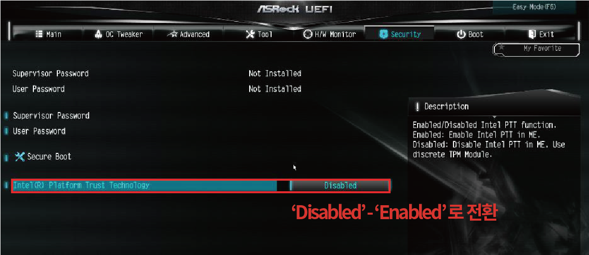 ˙Intel 메인보드 : 'Security' 항목으로 이동 후 - 'Intel(R) Platform Trust Technology' - 'Enabled'로 전환