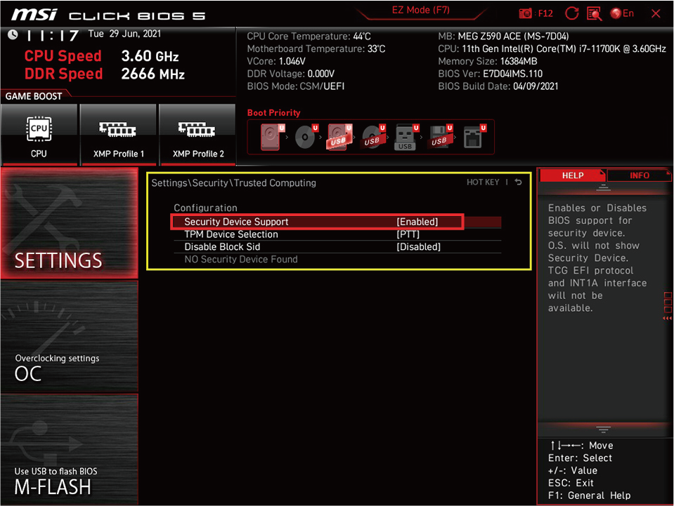 ˙Intel 메인보드 : 'Settings' - 'Security' - 'Trusted Computing' - 'Security Device Support' - 'Enabled'로 전환